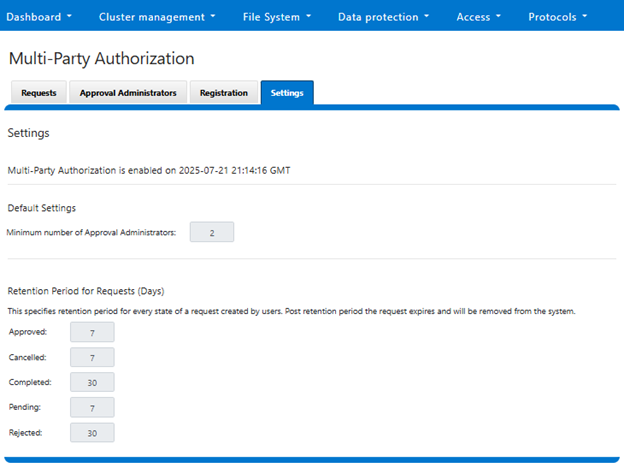 # isi mpa settings request-lifecycle list Approved Description: expire in configured days for privilege action execution. Expire_time: 7d Cancelled Description: remove from system in configured days. Expire_time: 7d Completed Description: remove from system in configured days. Expire_time: 30d Pending Description: expire in configured days can be updated by user or approver. Expire_time: 7d Rejected Description: remove from system in configured days. Expire_time: 30d