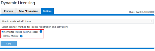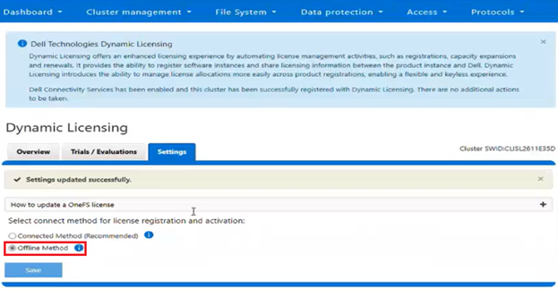 - From a cluster running OneFS 9.13 or later, select Dynamic Licensing ‘Offline Method’ from the WebUI under Cluster management > Dynamic Licensing > Settings: