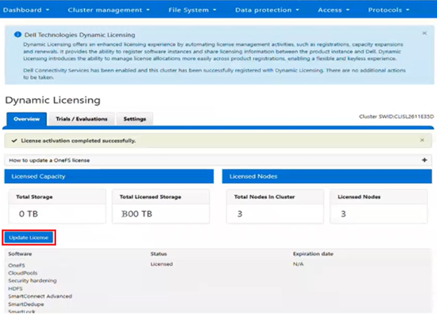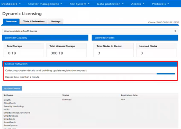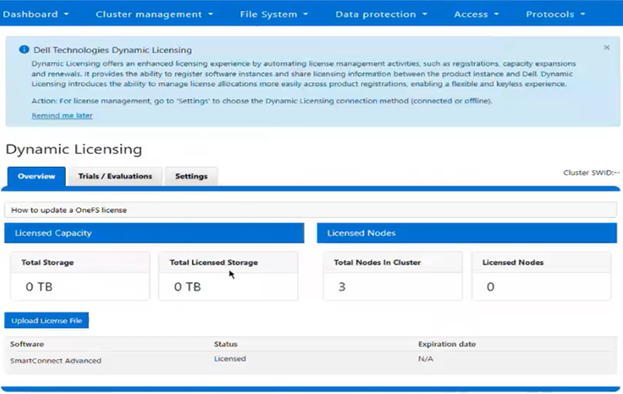 - From a fresh cluster running OneFS 9.13 or later, navigate to Cluster management > Dynamic Licensing > Overview: