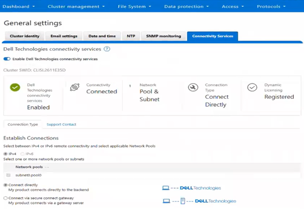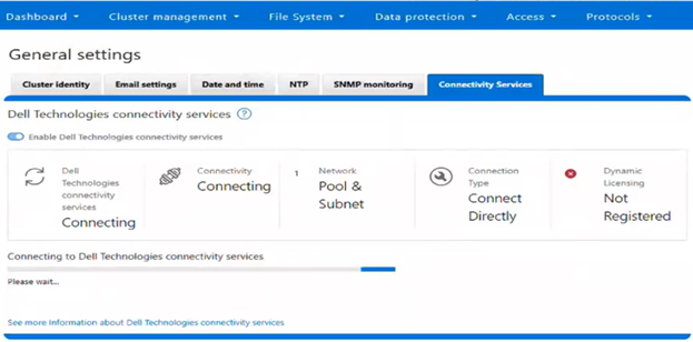 - Ensure that Dell Technologies Connectivity Services (DTCS) are enabled. This can be accomplished via the WebUI’s connectivity services wizard, under General Settings > Connectivity Services:
