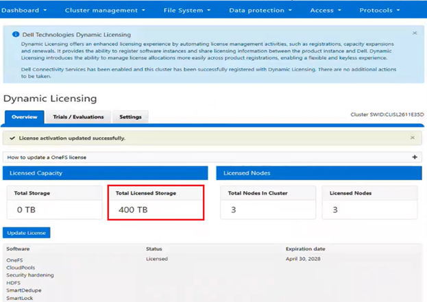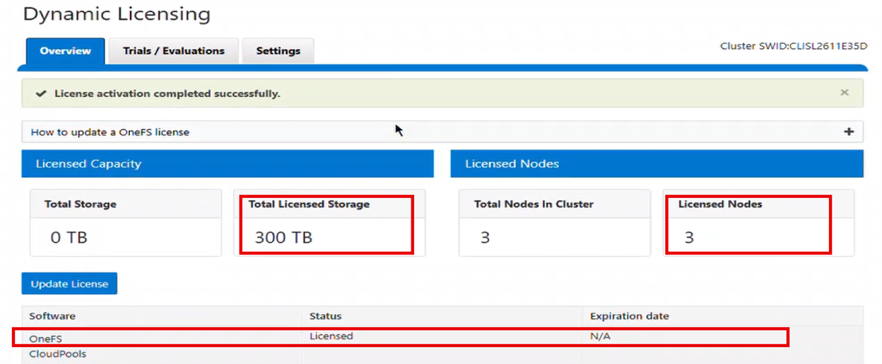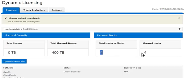 - From the WebUI under General Settings > Dynamic Licensing > Overview, the cluster now reports its licensed storage and nodes: