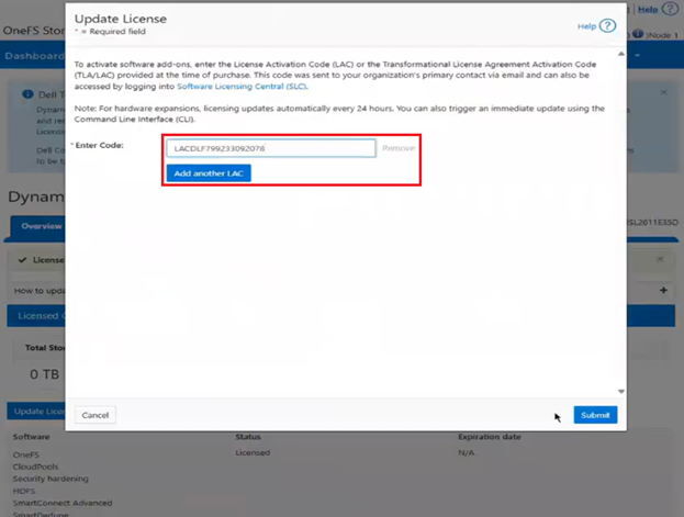 - This brings up the ‘Update License’ window, which allows the additional OneFS software and data services licenses to be activated. The License Activation Code (LAC) can be added for each licensed entity: