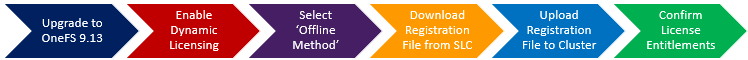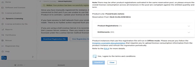 In summary, clusters running Dynamic Licensing in offline mode require the administrator to download an updated registration file whenever license changes occur. When additional entitlements are purchased, a new registration file must be created in the Dell Licensing Portal and uploaded to the PowerScale cluster: