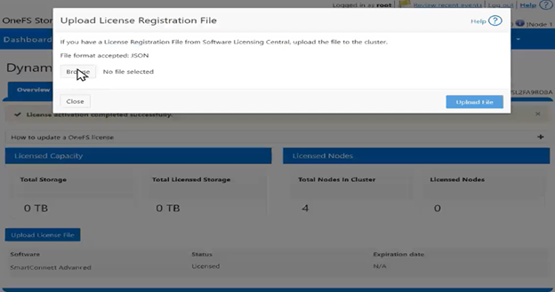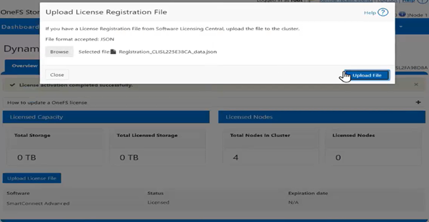 - Next, from the ‘upload license registration file’ window, the JSON file is located, and the ‘upload file’ button clicked to apply the license registration to the PowerScale cluster: