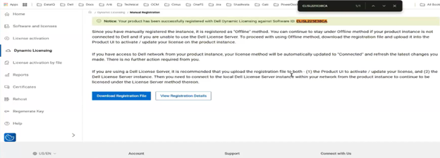 In this case, the cluster admin has to access the Dell Licensing Portal (SLC), provide the cluster inventory, download the licensing file, and then perform the registration as follows: