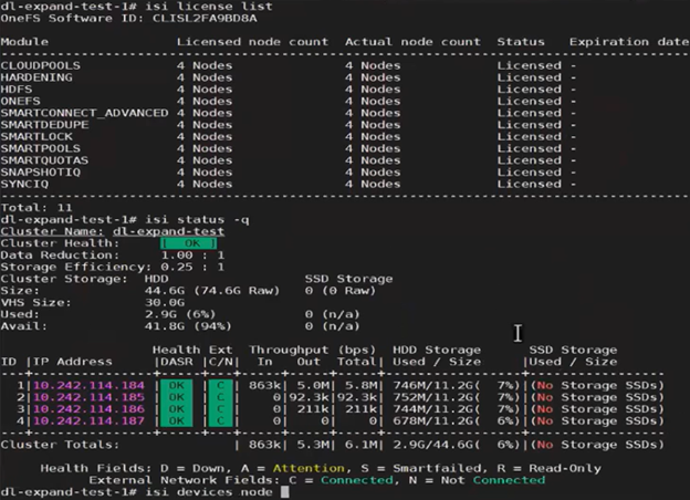 The ‘isi devices’ CLI command now shows the fourth node up and joined to the cluster: