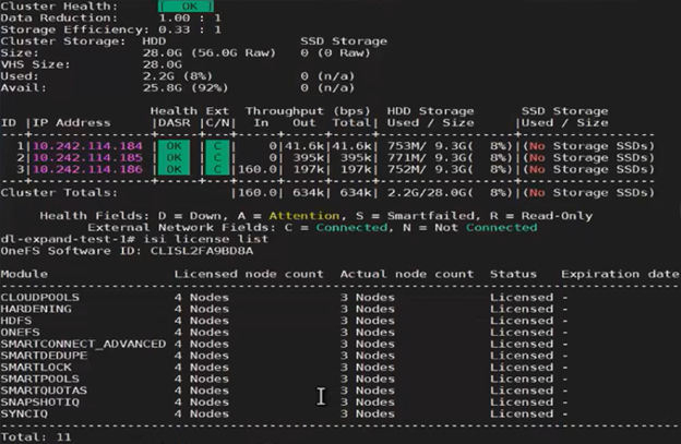 In this case, we’ve added an additional OneFS license to the entitlements, so the ‘Licensed node count’ now reports five nodes, while the ‘Actual node count’ still shows the cluster’s four nodes. This is similarly reported from the WebUI: