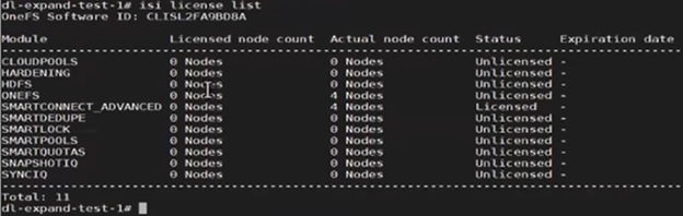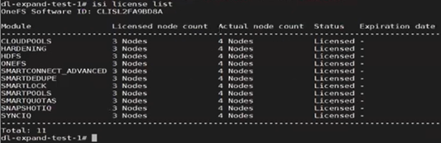 The output above indicates that the product registration has been successfully executed, and the reduced node count is now reflected in the ‘isi license output’: