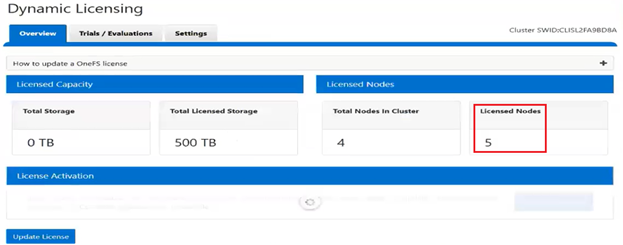 | Hardware expansion | When a new node is added to the cluster, the Dynamic Licensing cron job detects the change and initiates the registration process using the Service Tag of the newly added node. |