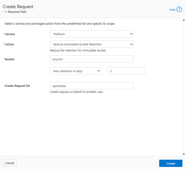 For example, to create a ‘Platform’ service request to reduce the retention for an immutable bucket to 2 days: