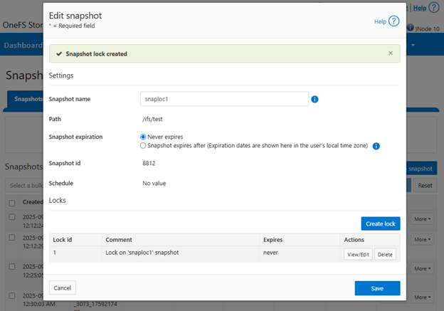 SnapshotIQ locks function as follows. For example, a manual snapshot, ‘snaploc1’ is taken of /ifs/test: