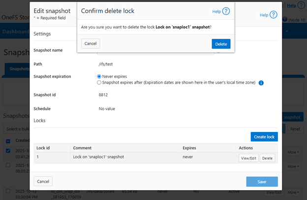 # isi snapshot snapshots delete snaploc1 Are you sure? (yes/[no]): yes Snapshot "snaploc1" can't be deleted because it is locked