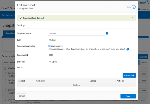 The CLI command ‘isi snapshot locks delete <lock_ID>’ can be used to clear existing snapshot locks, if desired. For example, to remove the only lock (ID=1) from snapshot ‘snaploc1’: