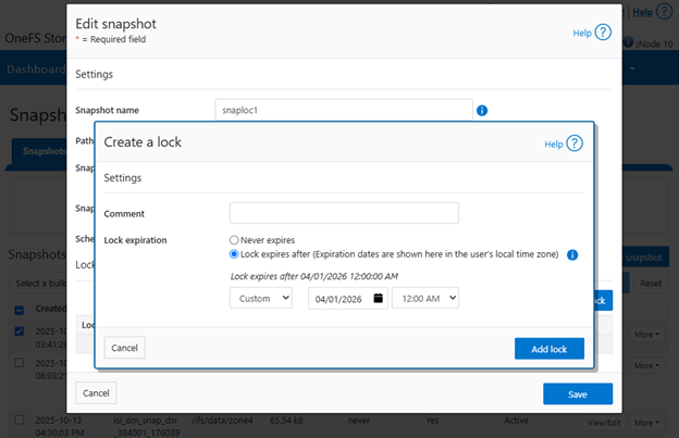 # isi snap lock create snaploc1 --expires '2026-04-01T12:00:00' # isi snap lock list snaploc1 ID ---- 36 ---- Total: 1 # isi snap lock view snaploc1 33 ID: 36 Comment: Expires: 2026-04-01T12:00:00 Count: 1