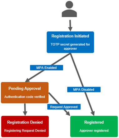 Next, add the approver users to MPA and complete their registration. This involves initiating registration, using the secret or embedded URL in conjunction with a third party code generator to create a time-based one-time password or TOTP.