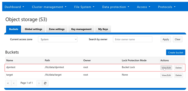 s3bucket     /ifs/data/dpmtest   root   replace            Yes                  Bucket Lock