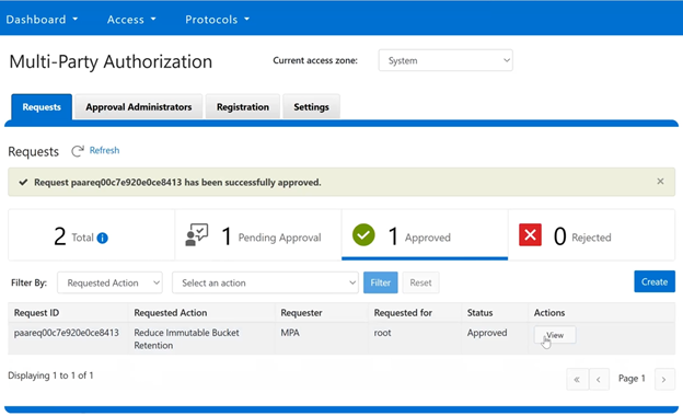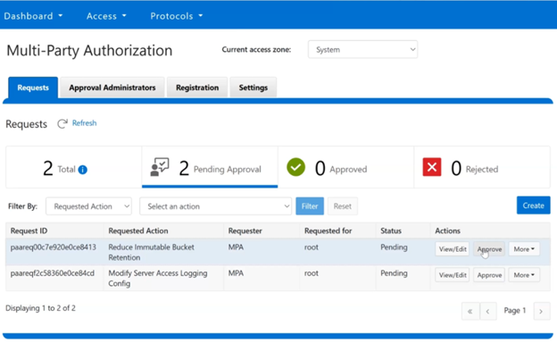 After logging into the WebUI with an MPA approver account and navigating to Access > Multi-Party Authorization > Requests, the two above S3 privileged action requests are displayed, one for reducing the immutable bucket retention period and the other for disabling server access logging:
